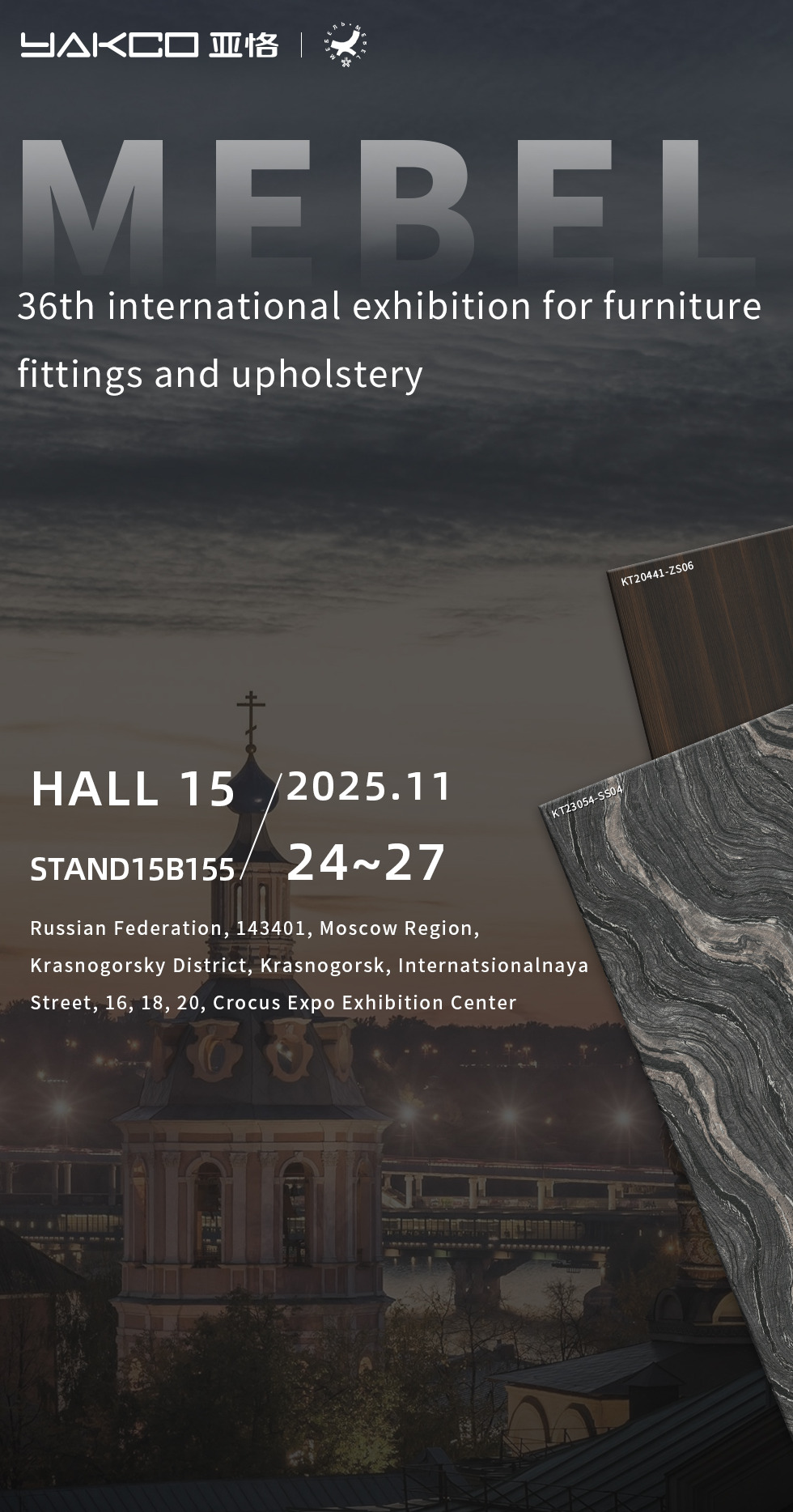 YAKCO New Materials (Jiangsu) Co., Ltd. oficjalnie ogłasza swój udział w 36. międzynarodowej wystawie okuć i tapicerki meblowej (MEBEL), która odbędzie się w Moskwie w Rosji. Wystawa odbędzie się w dniach 24–27 listopada, a firma powita gości z całego świata na stoisku nr 15B155.